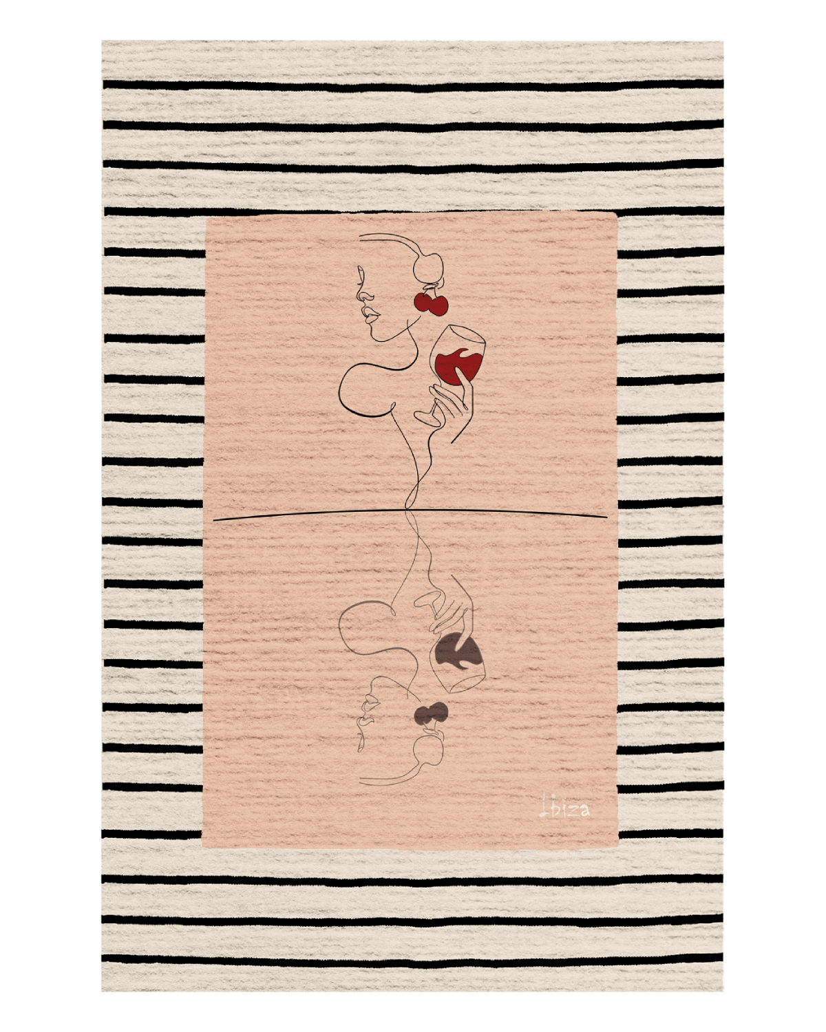 Un rosa tenue avvolge la sagoma di una donna elegante, che con grazia solleva un calice di vino rosso, mentre un piccolo grappolo di ciliegie, come un raffinato orecchino, dona un tocco di freschezza e gioia. Il fondo delicato riflette l’atmosfera rilassata e vibrante dell’isola.