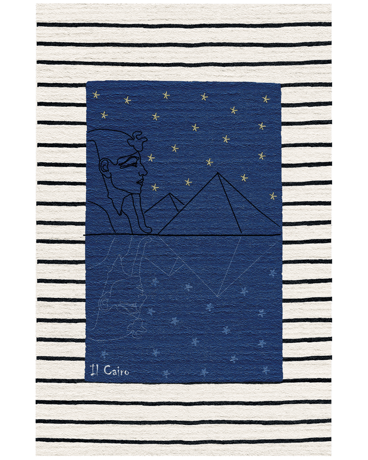 “Il Cairo” è un tappeto che evoca l’incanto notturno dell’antico Egitto, dove il fascino dell’archeologia incontra la poesia del cielo stellato. Un omaggio alla grandezza enigmatica del Mediterraneo del sud.