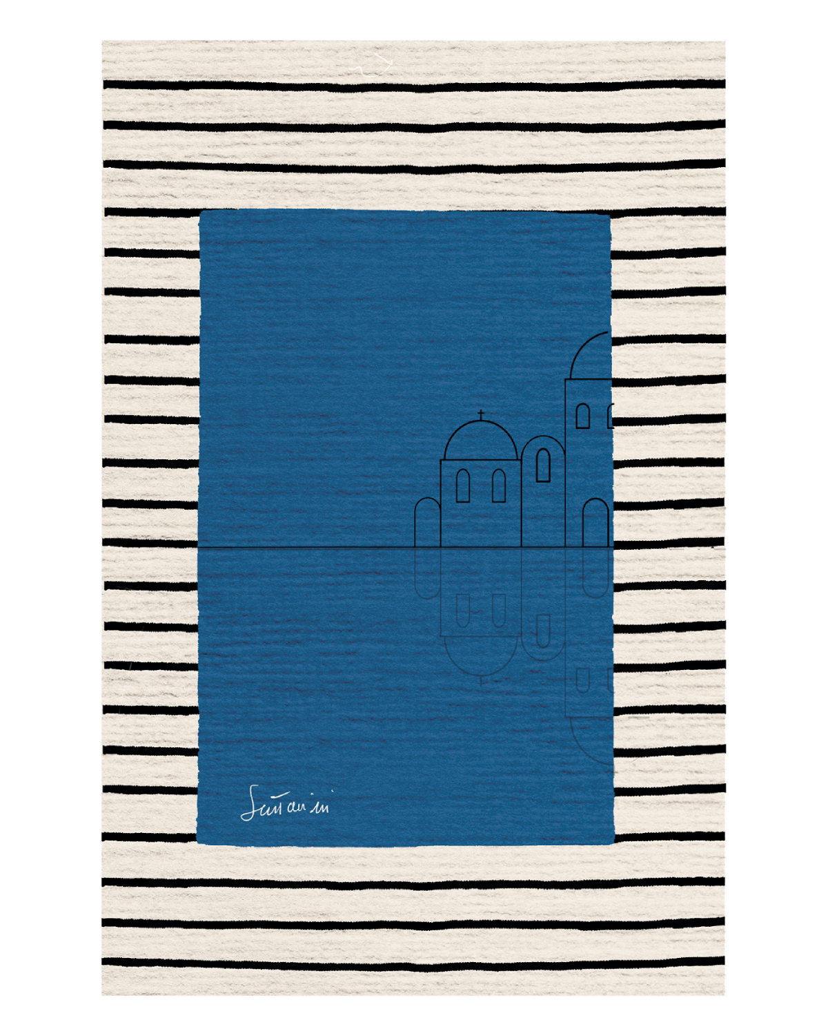 Il pattern a righe evoca l’orizzonte marino, la brezza dell’Egeo, la serenità sospesa. Al centro, su un fondo blu profondo, risplendono le iconiche cupole dell’isola, un simbolo di perfezione architettonica e spirituale.